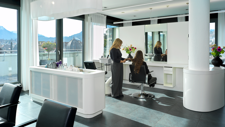 Im 6. Stock gelegen, bietet unser Salon in Luzern nicht nur erstklassigen Service, sondern auch eine atemberaubende Aussicht auf die Alpenkette.